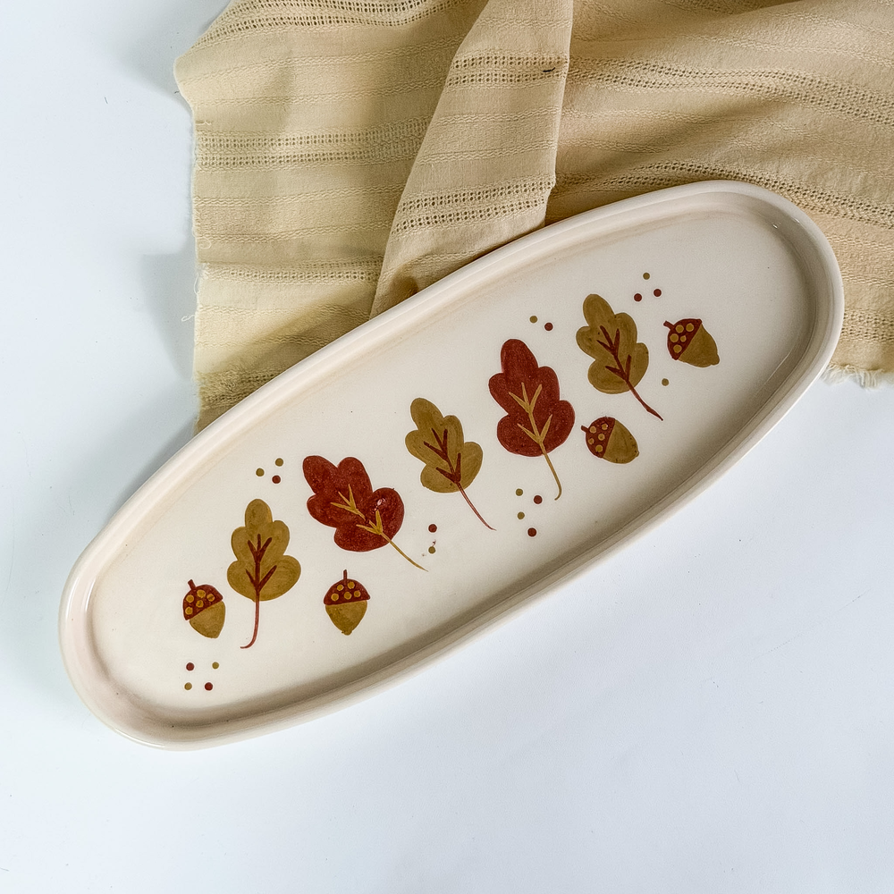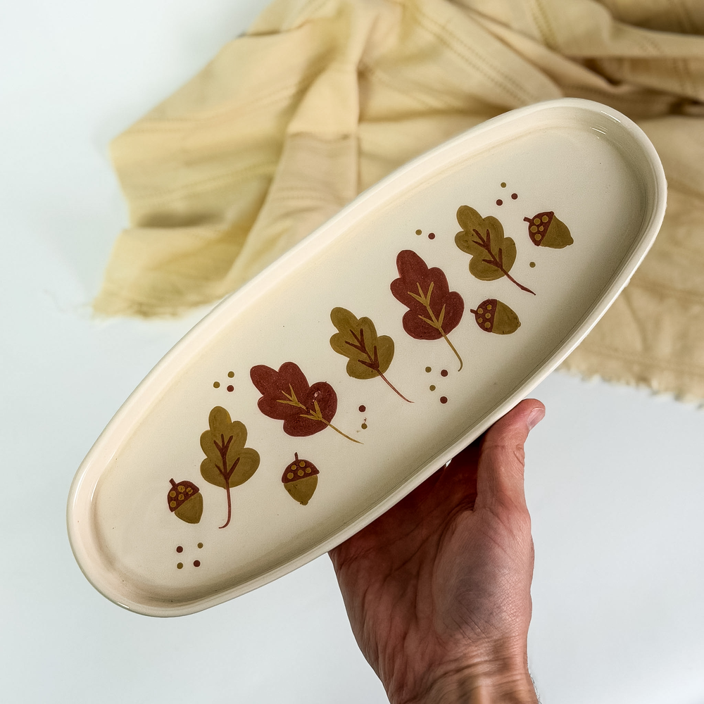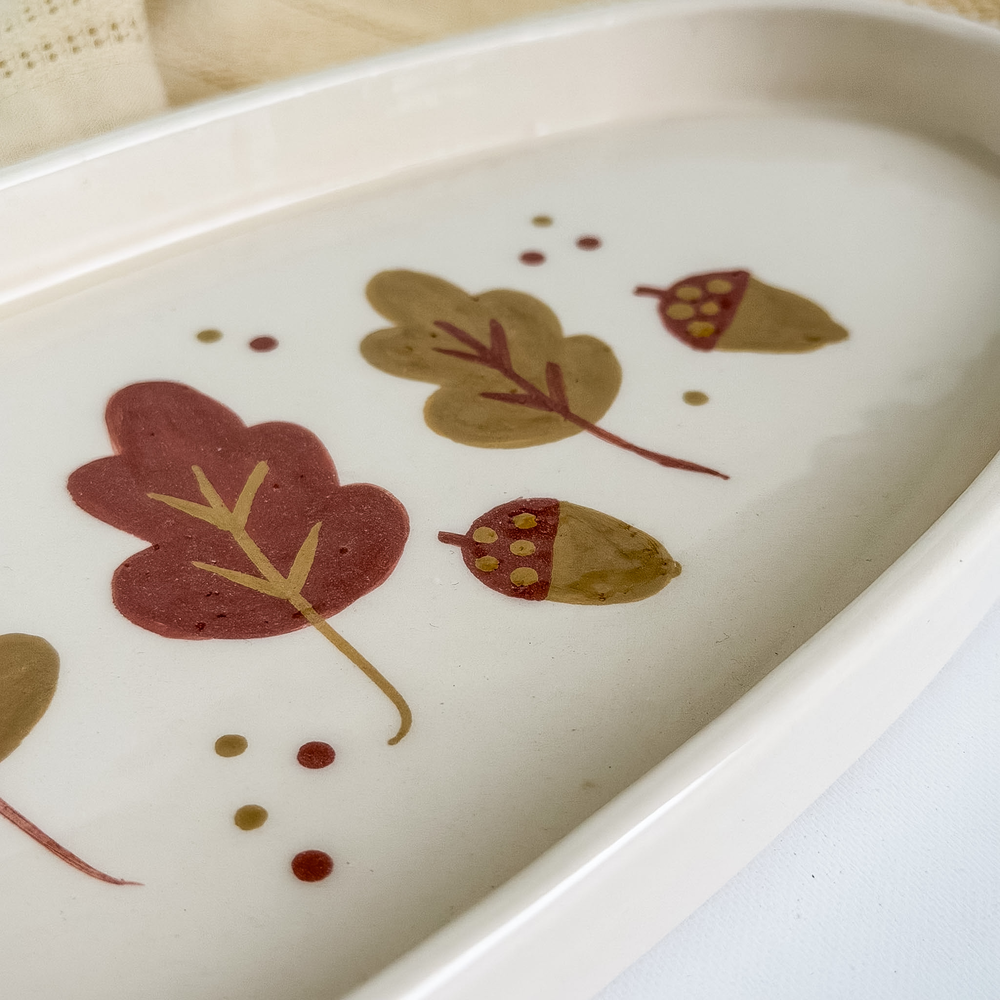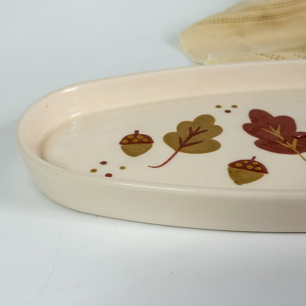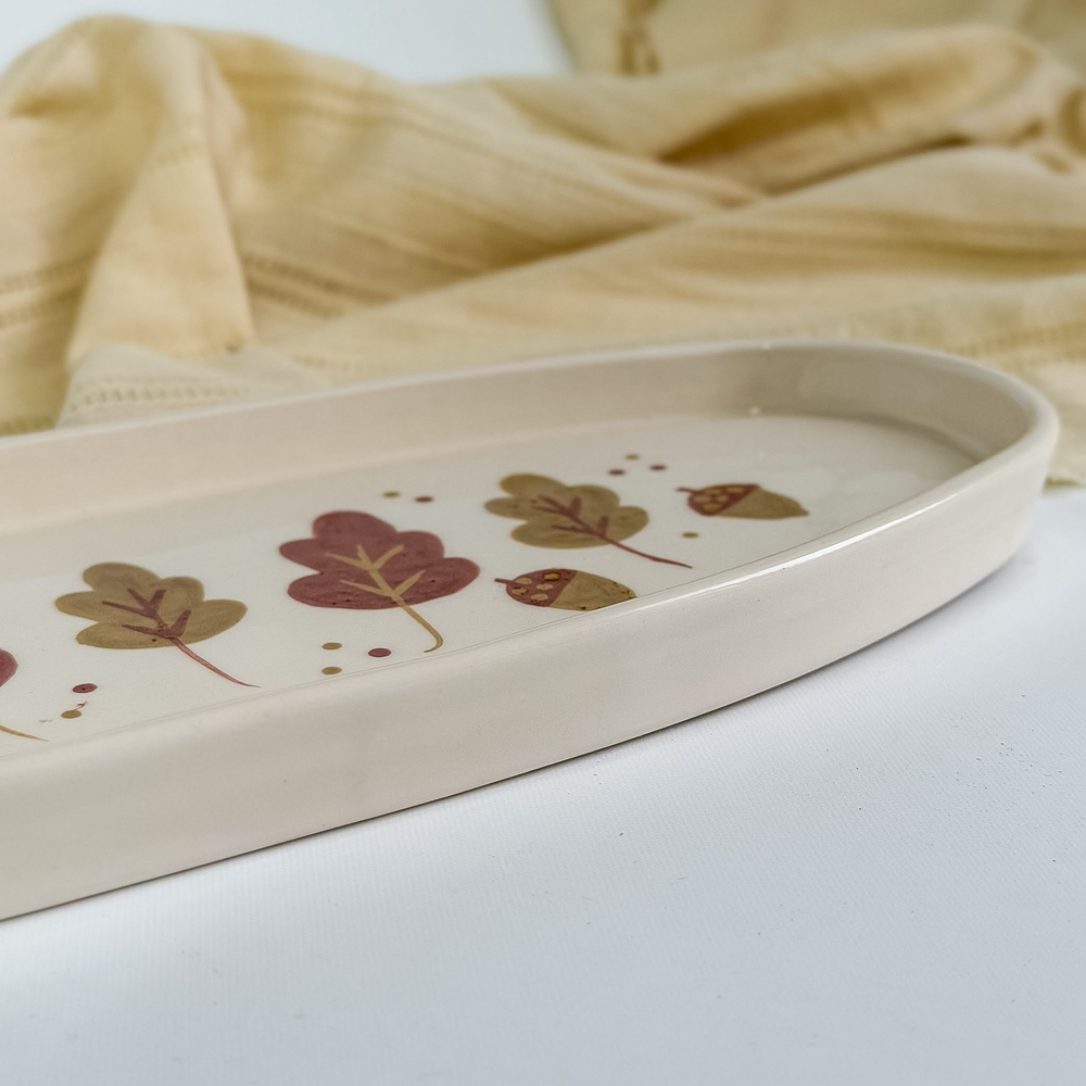 Bandeja TANIT de completa producción artesanal pintada con motivos otoñales. Excelente esmalte de cristal que le da un toque natural y armonioso para decorar mesas y presentar objetos con elegancia.