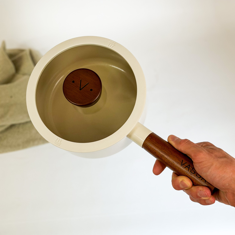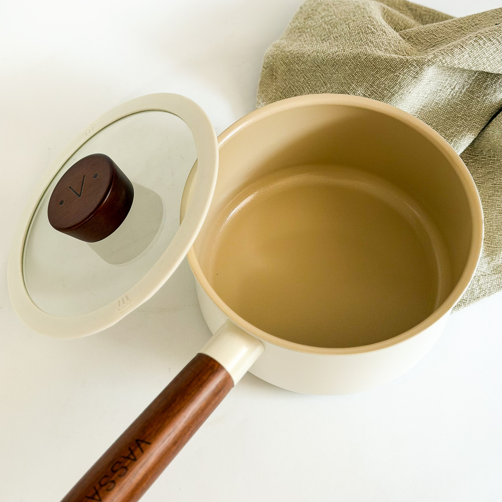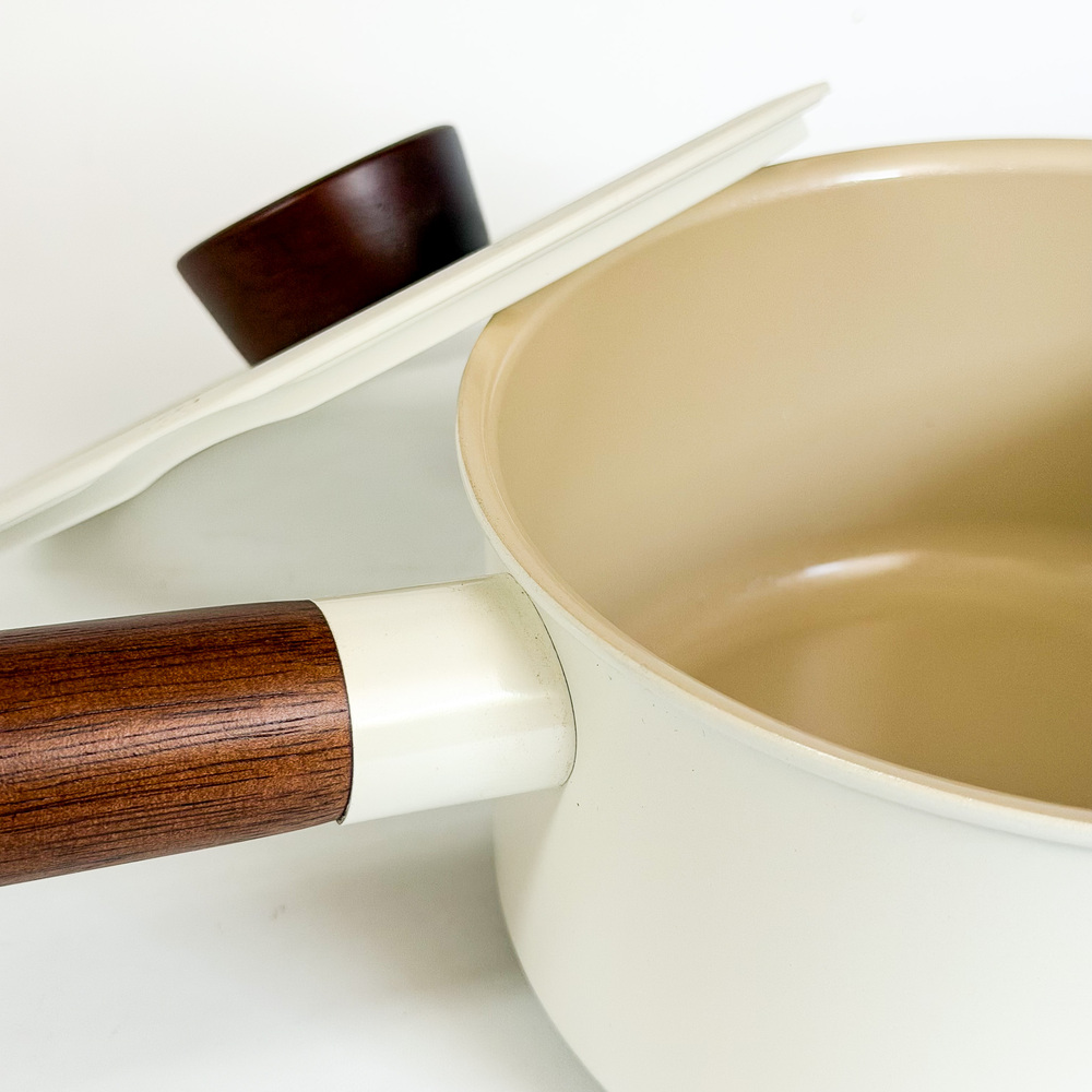 Olla con tapa, fabricado con aluminio y con recubrimiento antiadherente, color beige, mango de madera.