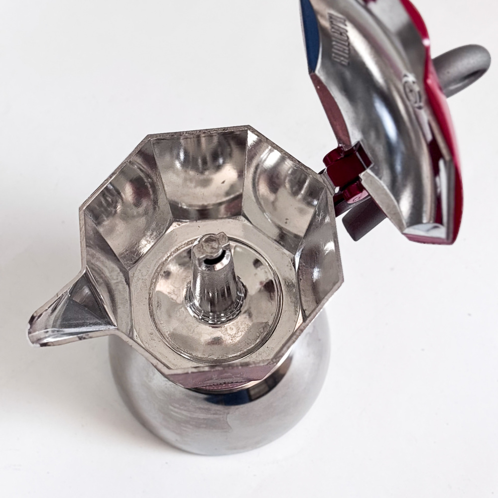 Una combinación funcional de materiales hace que esta cafetera sea única e inimitable: la cámara de recolección de aluminio octogonal representa la tradición y la continuidad con el histórico Moka Express mientras que la caldera de acero con forma cónica truncada también permite su uso en placas de inducción.