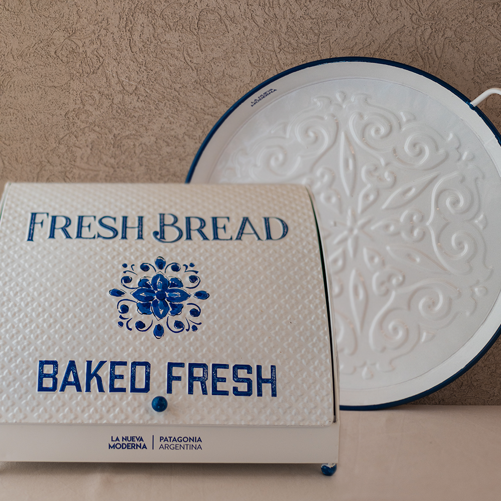 Contenedor de pan con tapa rebatible hacia arriba. Base blanca con tapa estampada en sobrerelieve con inscripción y motivo floral. Dimensiones: 34 x 29 x 25,5 cm.