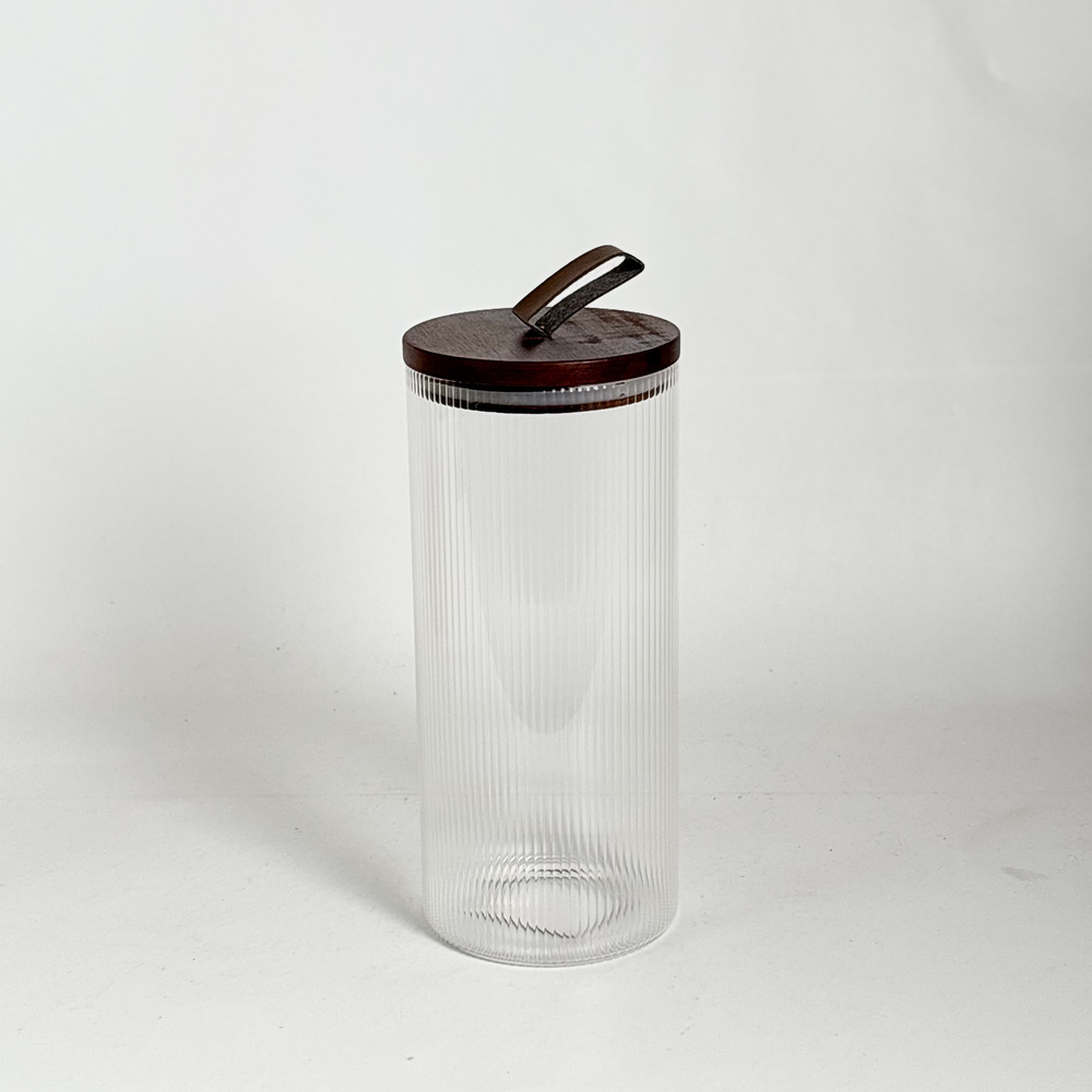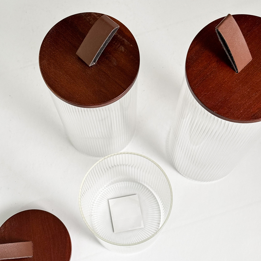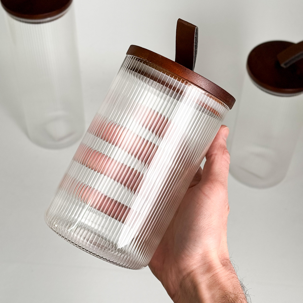 Frascos redondos cilíndricos de vidrio, con trama de rayas verticales y tapa hermética de acacia. La tapa incluye tirador de cuero.