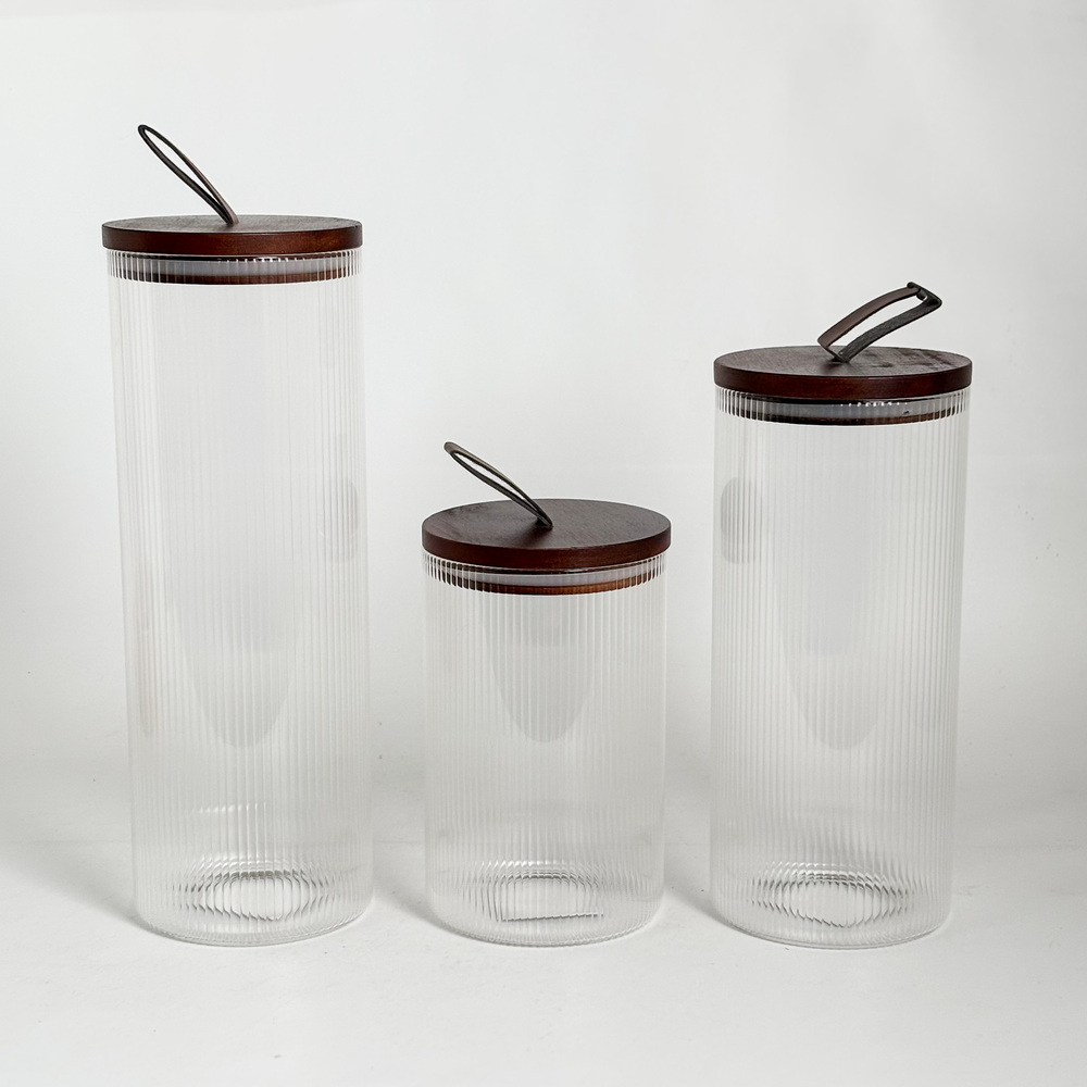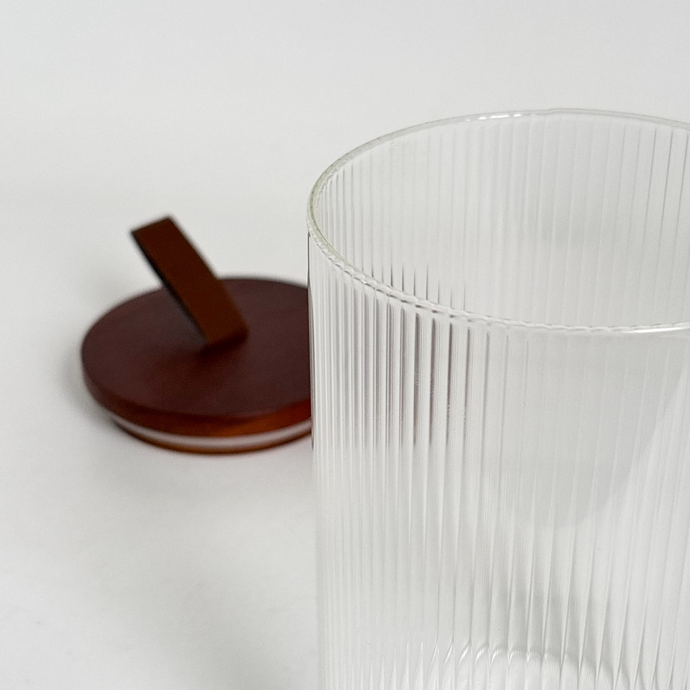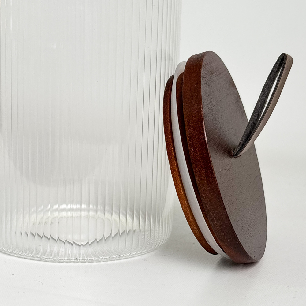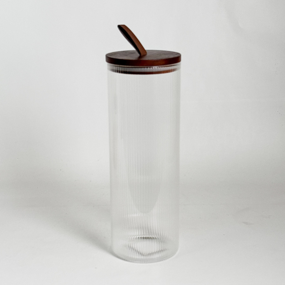 Frascos redondos cilíndricos de vidrio, con trama de rayas verticales y tapa hermética de acacia. La tapa incluye tirador de cuero.