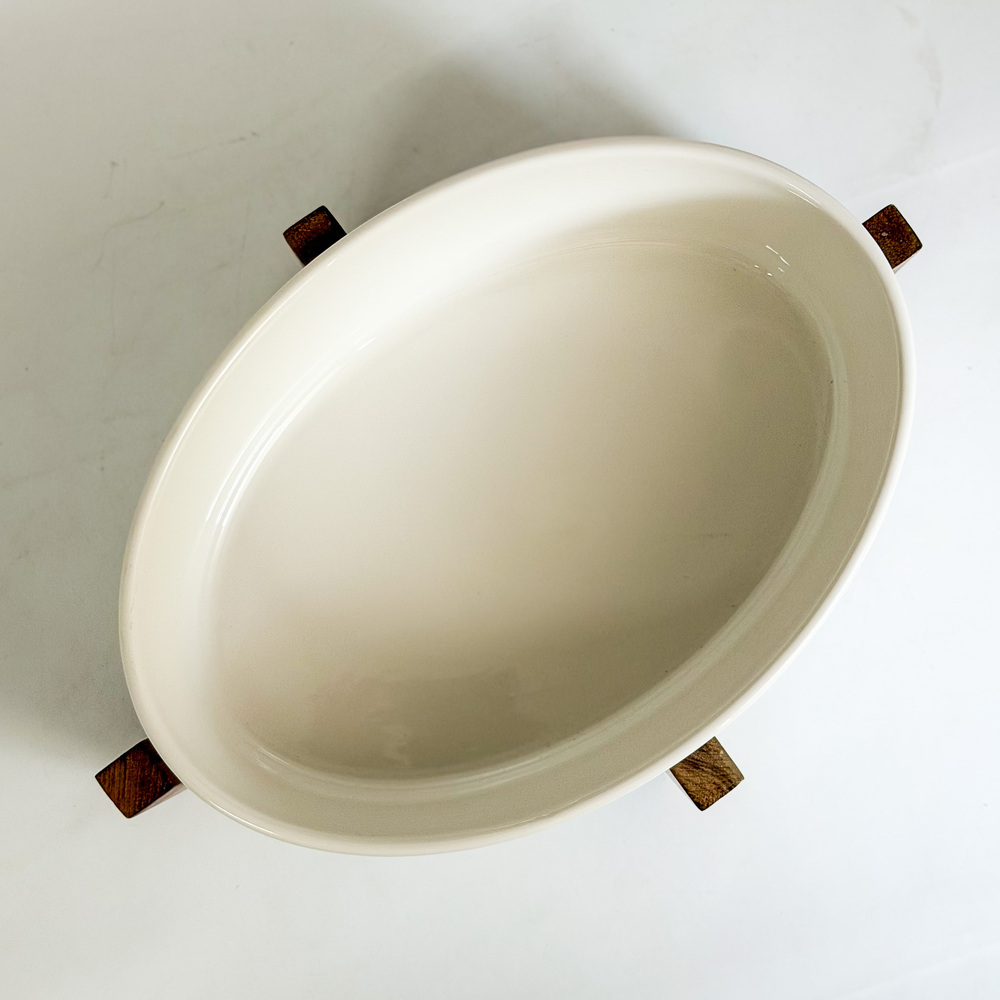 Fuente bandeja ovalada de cerámica blanca, apta para cocción en horno, con base de madera para apoyo en mesa.