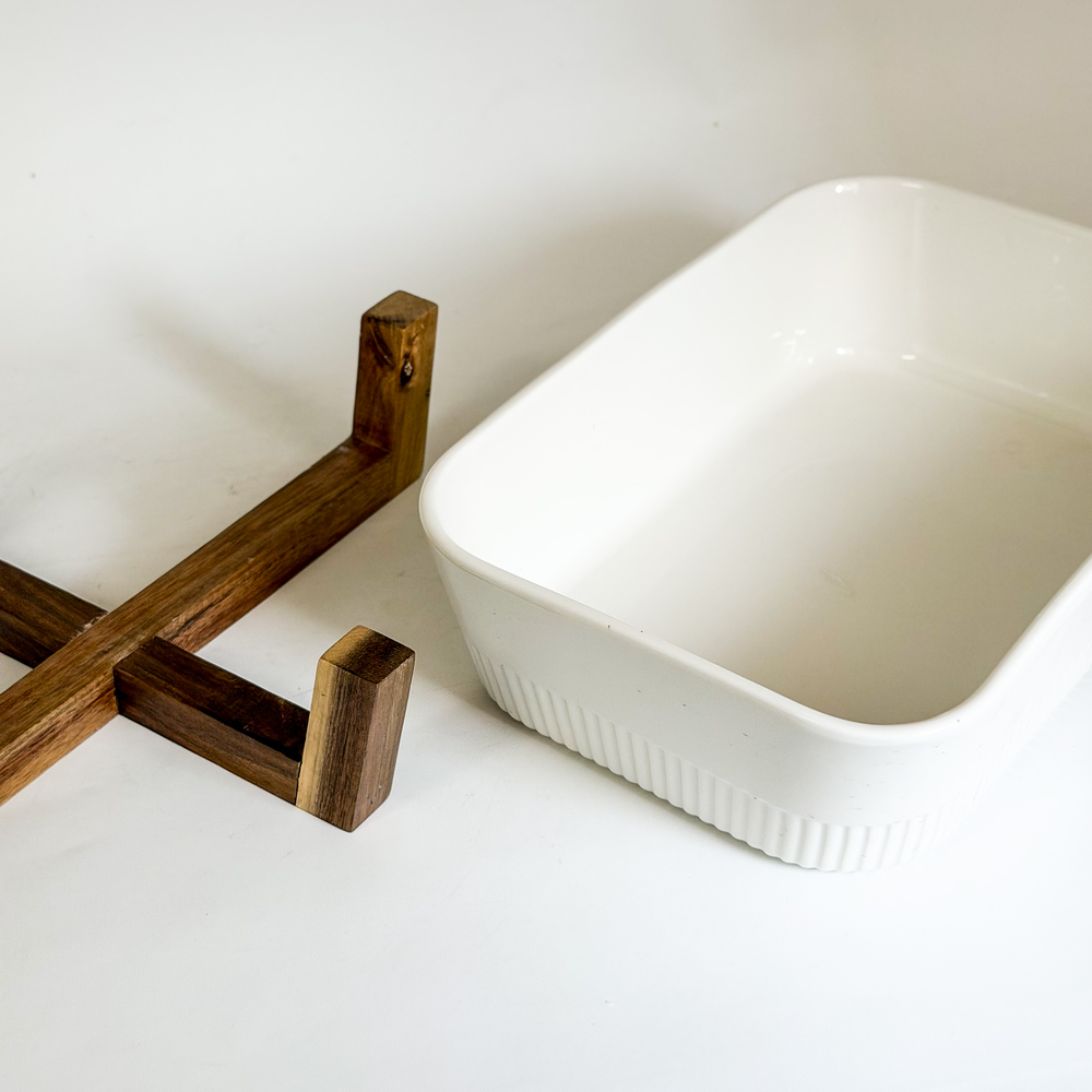 Fuente bandeja rectangular de cerámica blanca, apta para cocción en horno, con base de madera para apoyo en mesa.