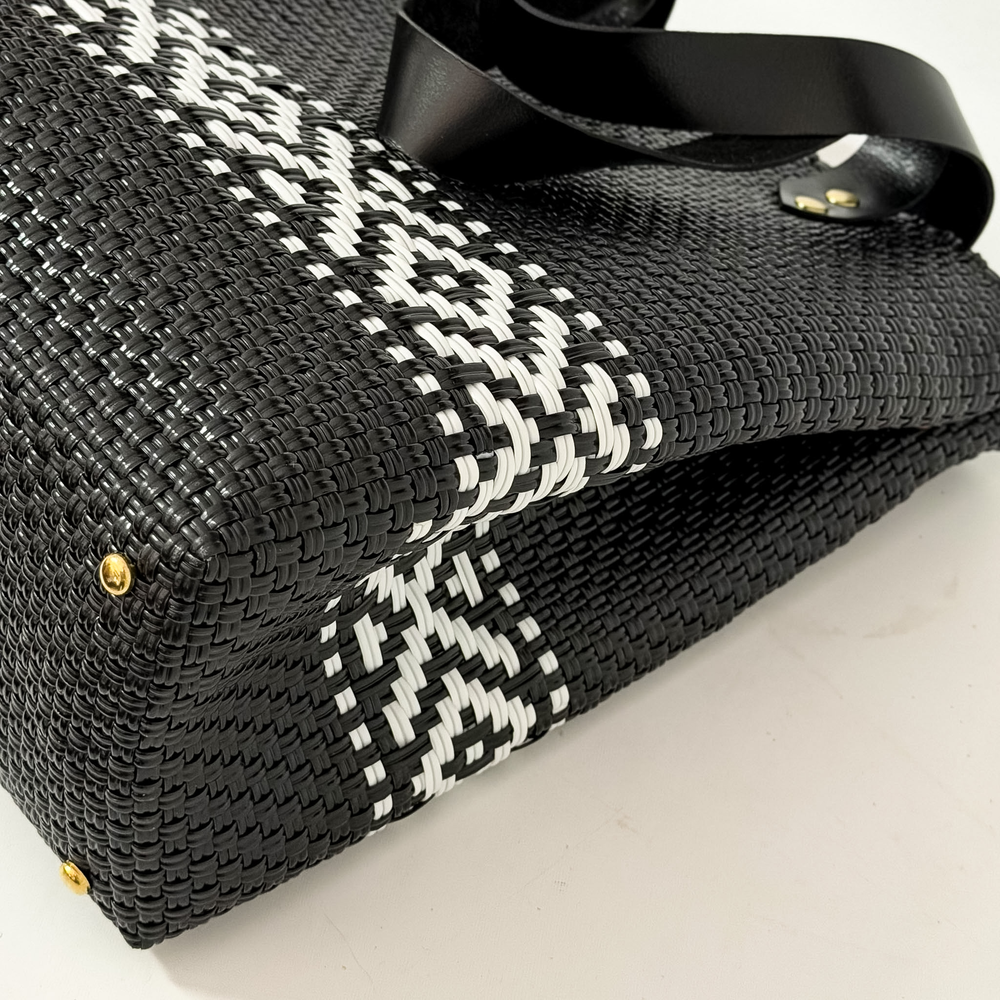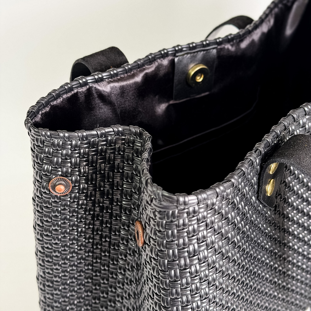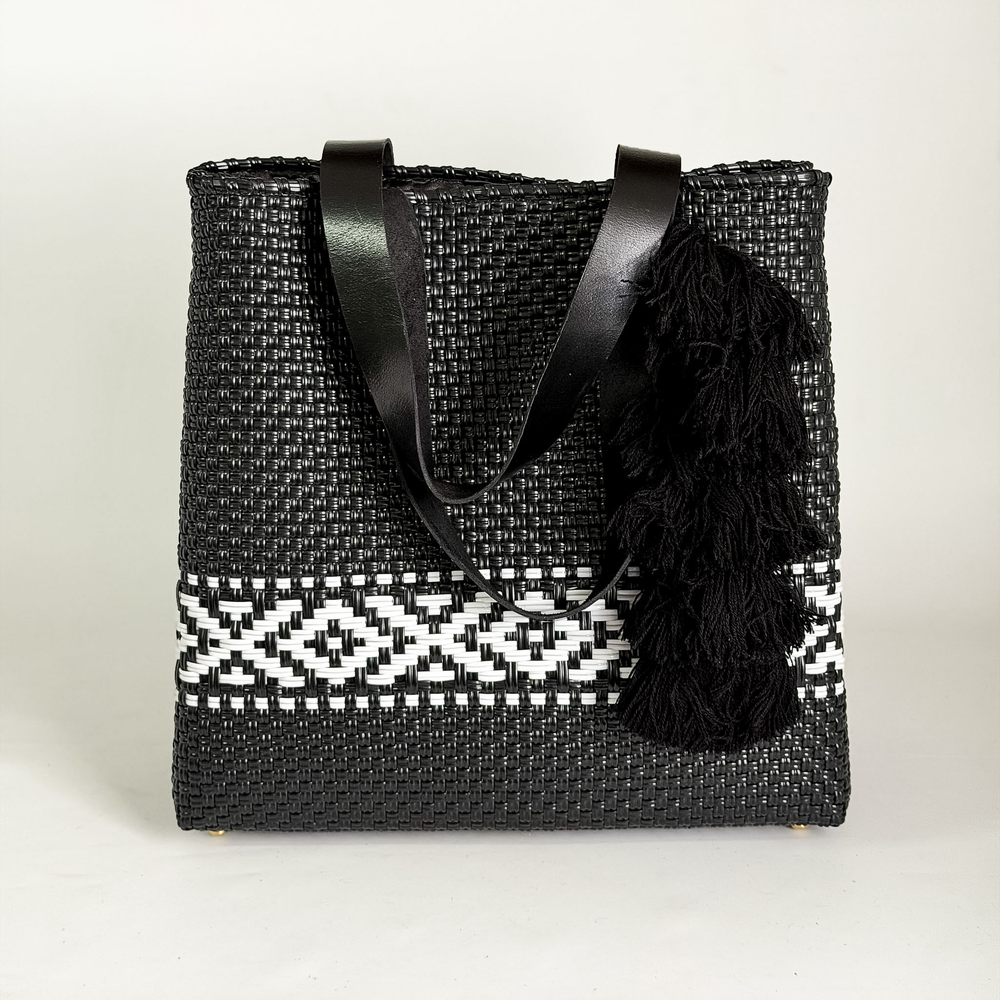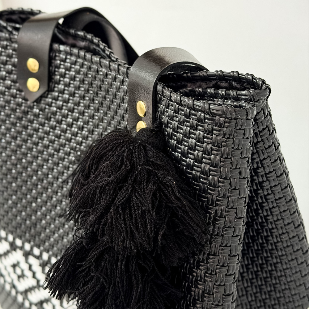 Bolso cartera handbag, producida con plástico reciclado, tejidas a mano, forradas por dentro y terminadas con correas y detalles en piel. Producidas en México.