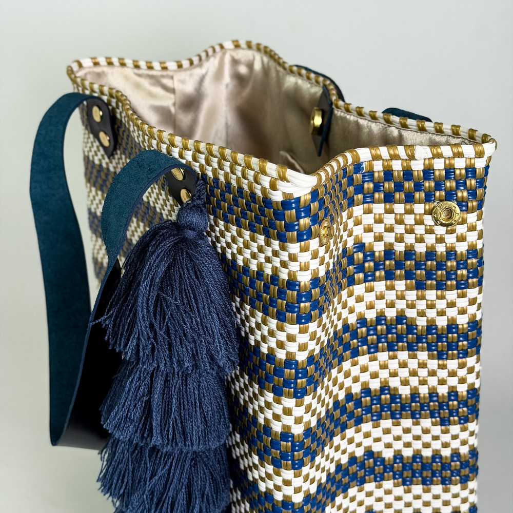 Bolso cartera handbag, producida con plástico reciclado, tejidas a mano, forradas por dentro y terminadas con correas y detalles en piel. Producidas en México.