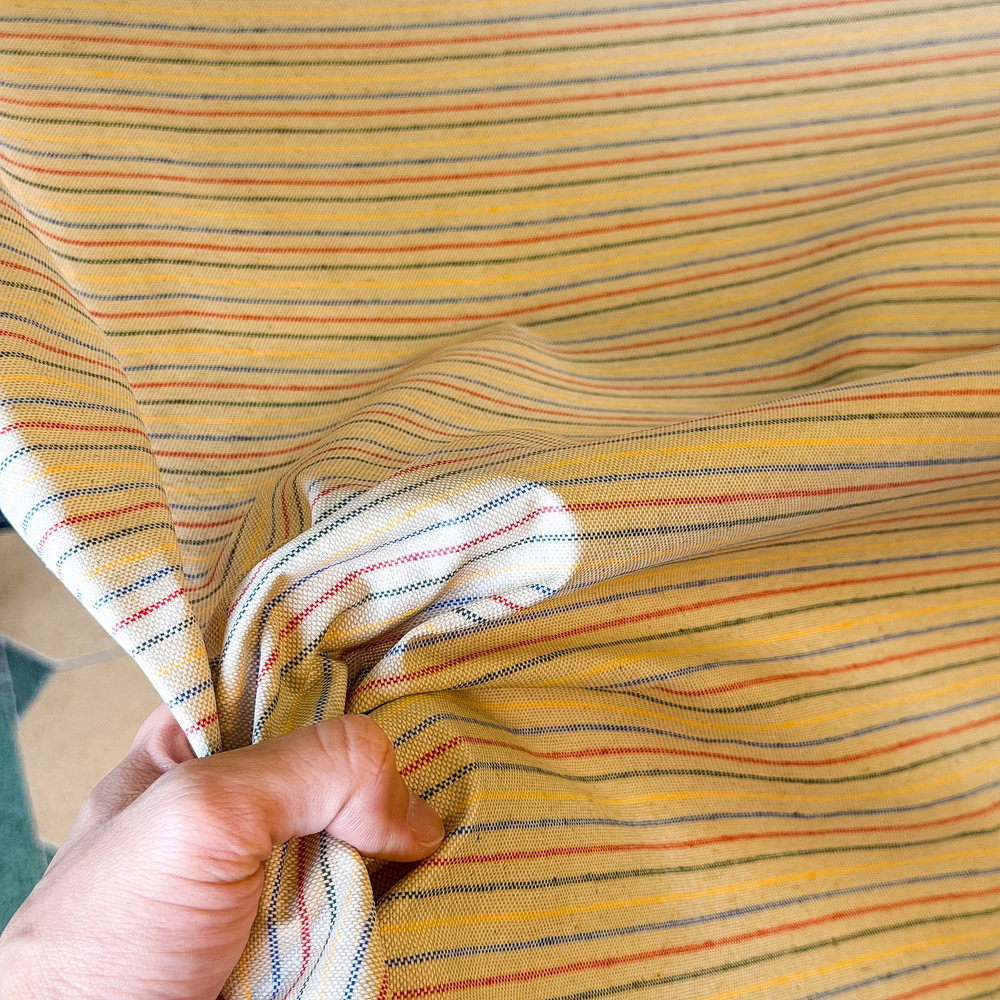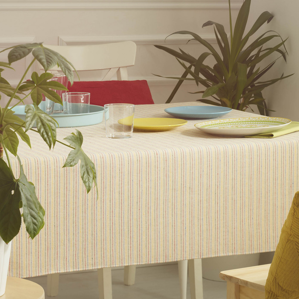 Tela antimanchas para manteles, individuales, delantales, almohadones de exterior. Diseño Brisa, rayas multicolor. Ancho de tela 1,50 m.