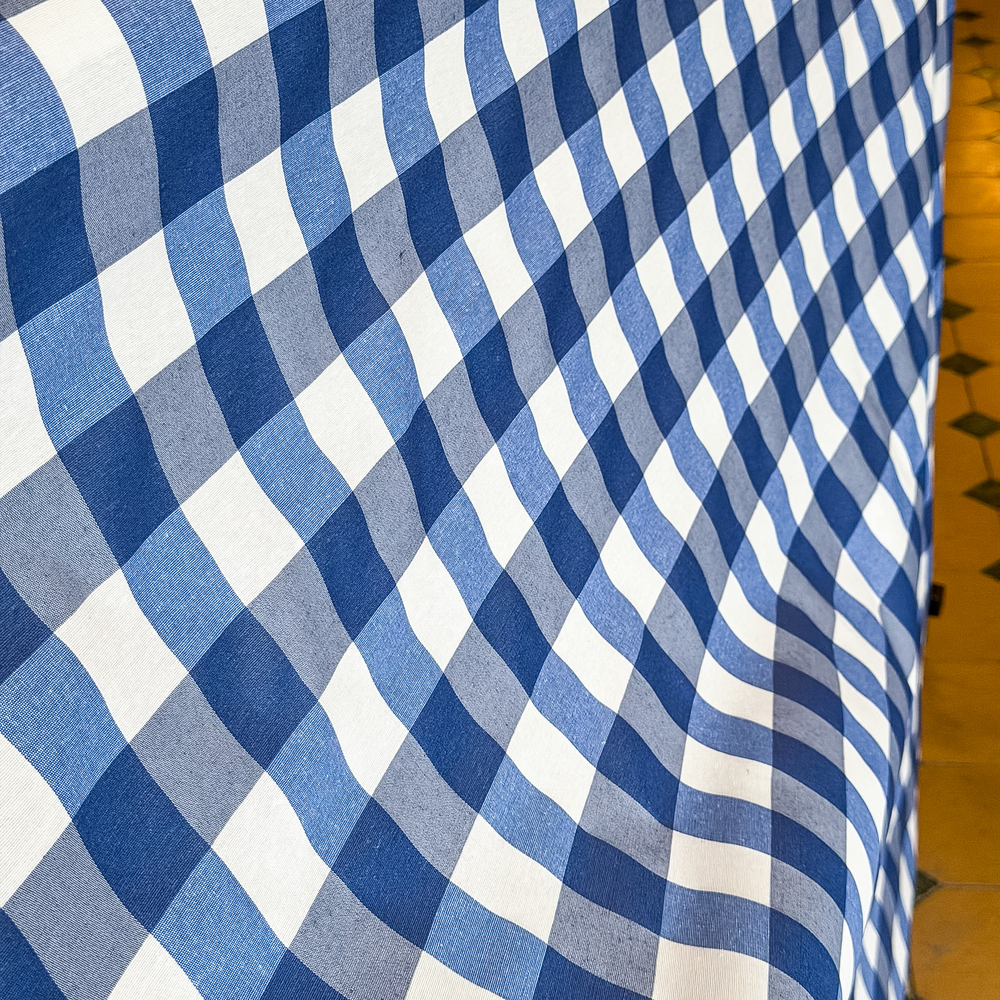 Tela antimanchas para manteles, individuales, delantales, almohadones de exterior. Diseño Nantes, cuadrillé color azul. Ancho de tela 1,50 m.