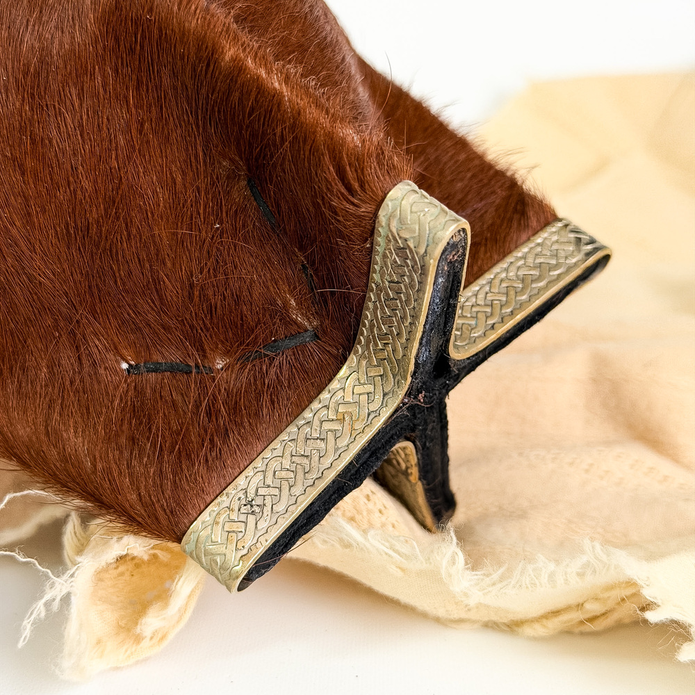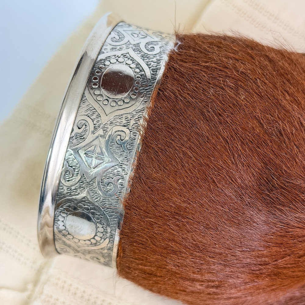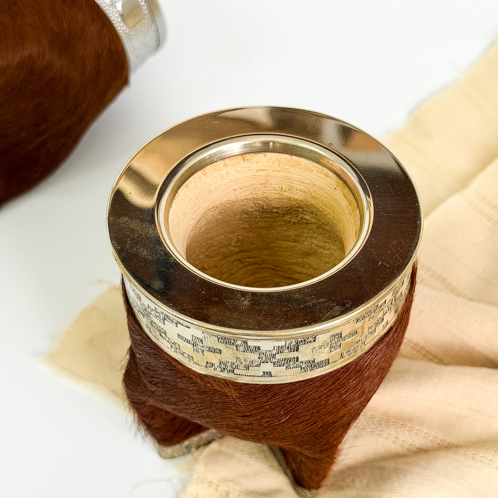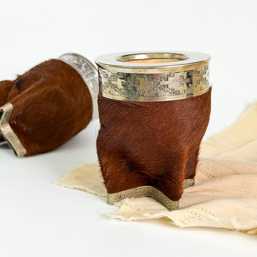 Mate imperial de calabaza grande y pareja, forrada en cuero con pelos que le da una apariencia audaz y llamativa.