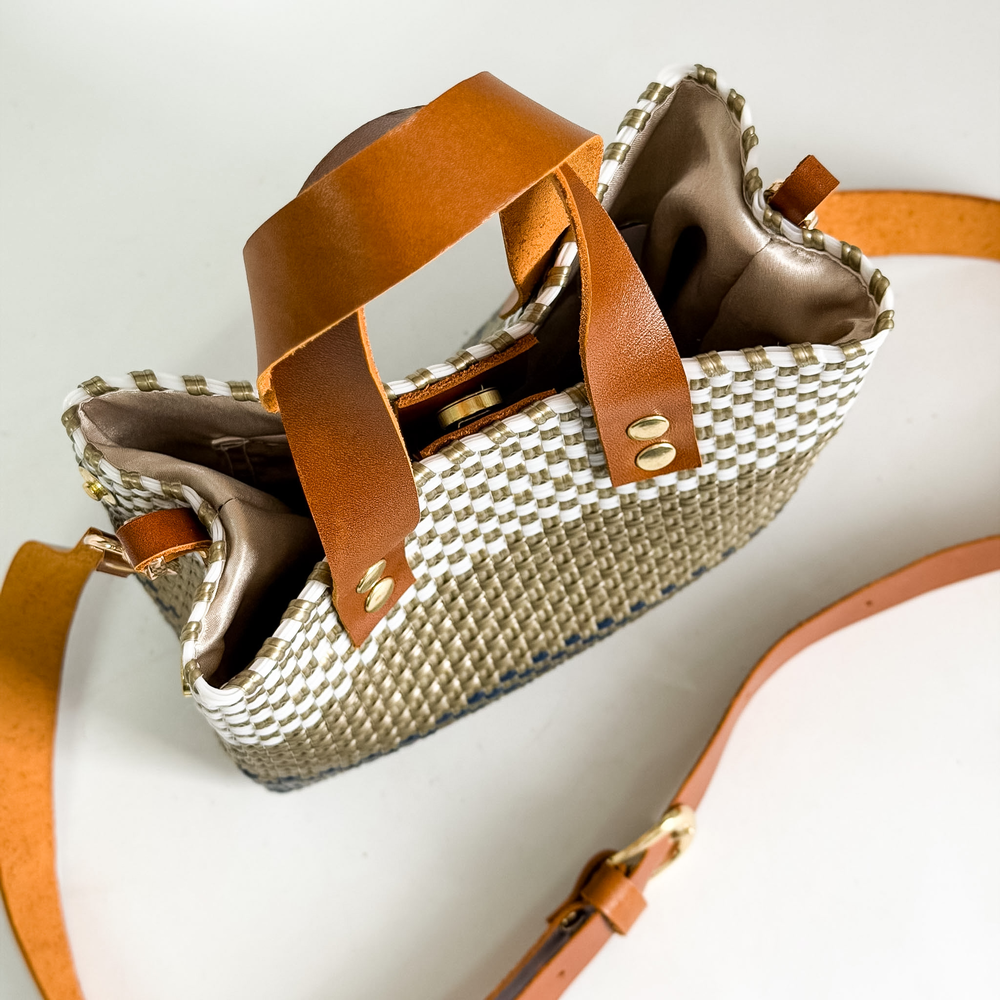 Mini bolso cartera minibag, producida con plástico reciclado, tejidas a mano, forradas por dentro y terminadas con correas y detalles en piel. Correa larga bandolera desmontable. Producidas en México.