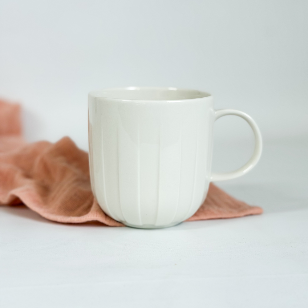 Taza mug de porcelana, diseño Merida, con elegantes franjas en bajo y sobrerrelieve.