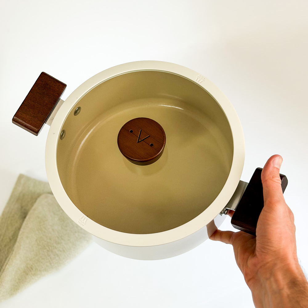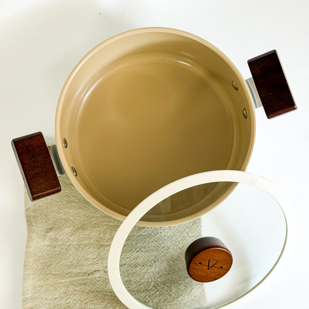 Olla de aluminio, con recubrimiento antiadherente, color beige, asas de madera.