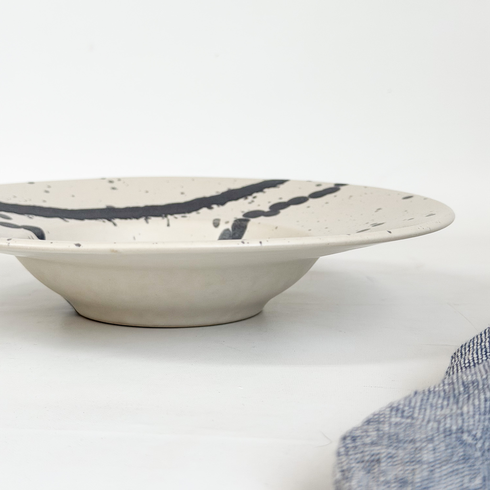 Plato para pasta, diseño chiado, con estampado de pintas grises.