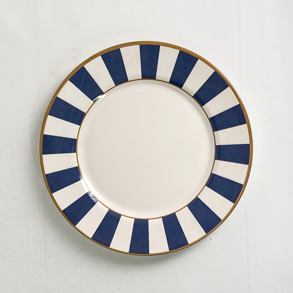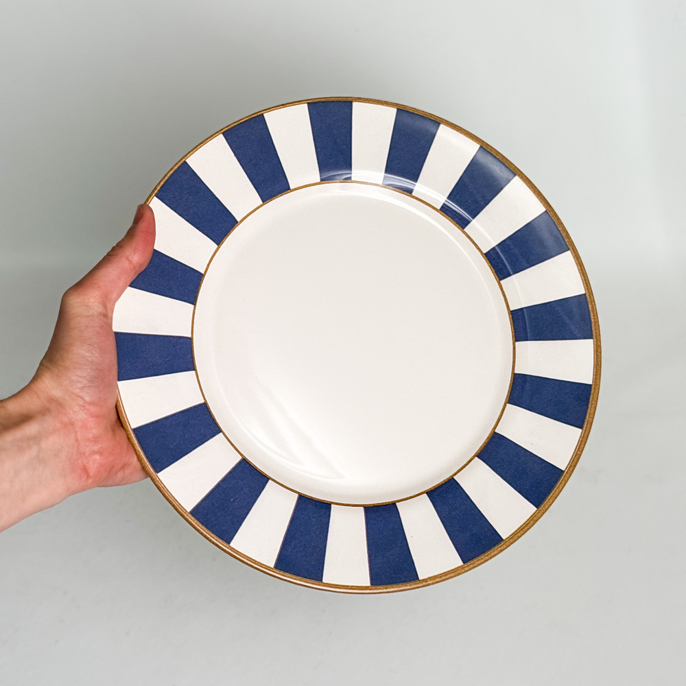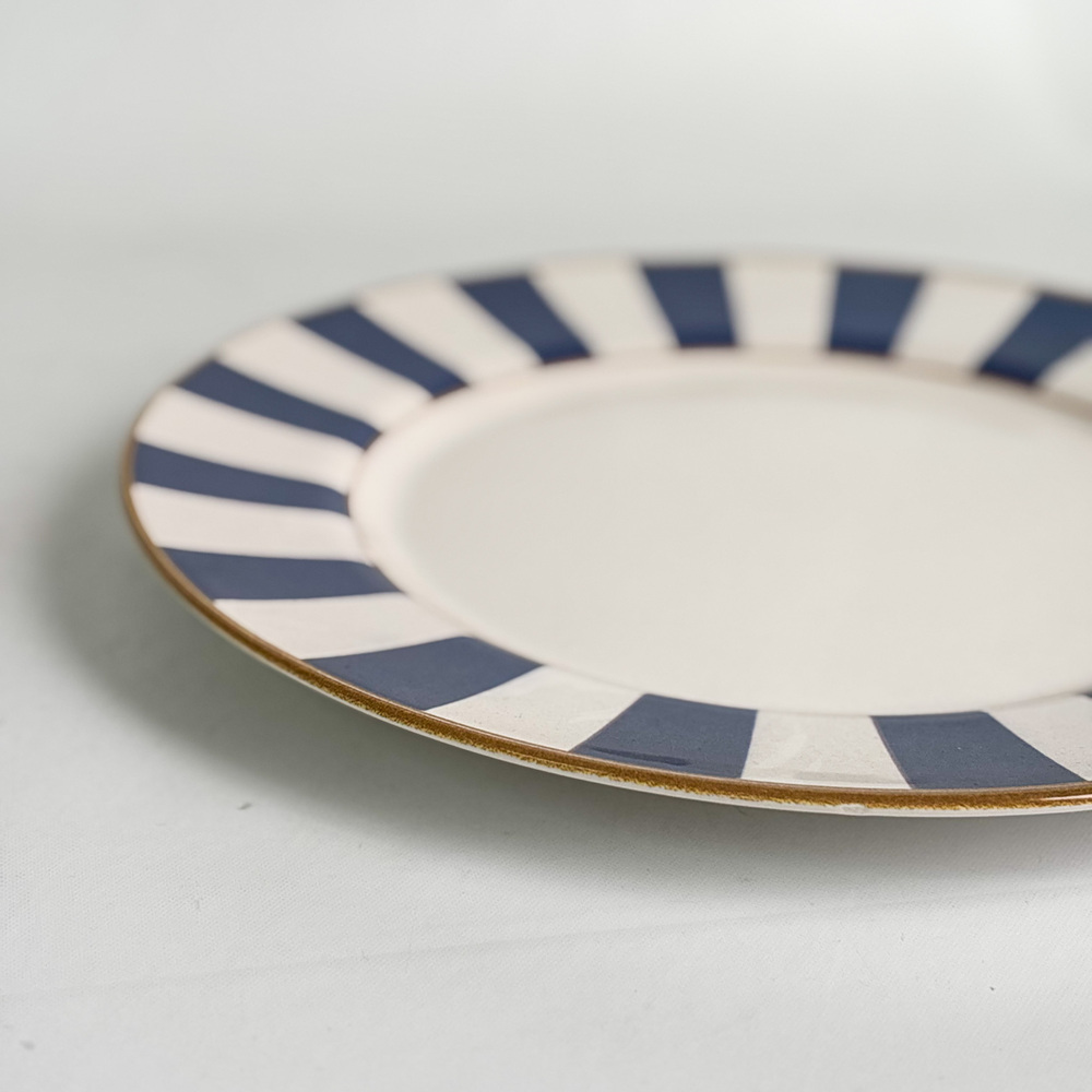 Plato principal de cerámica, diseño Stripe. Rayas azules en contorno, borde dorado. 29 cm de diámetro.