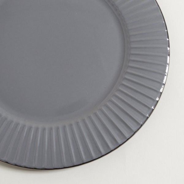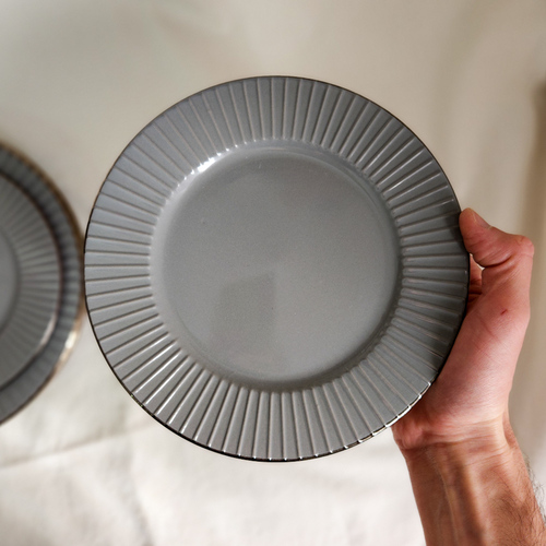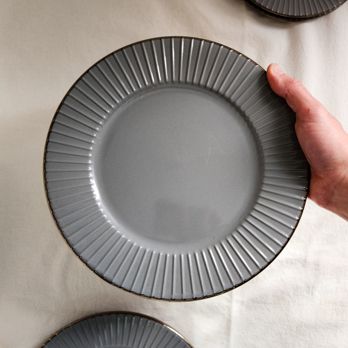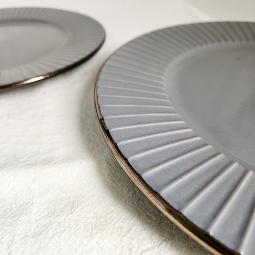 Plato cerámico gris con esmaltado brillante y borde dorado. Línea de diseño abu dhabi.