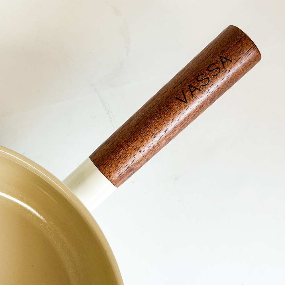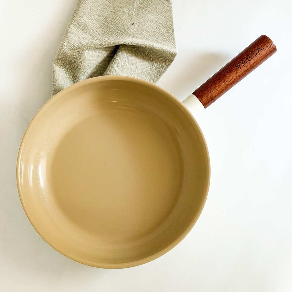 Sartén de aluminio, con recubrimiento antiadherente, color beige, asas de madera.