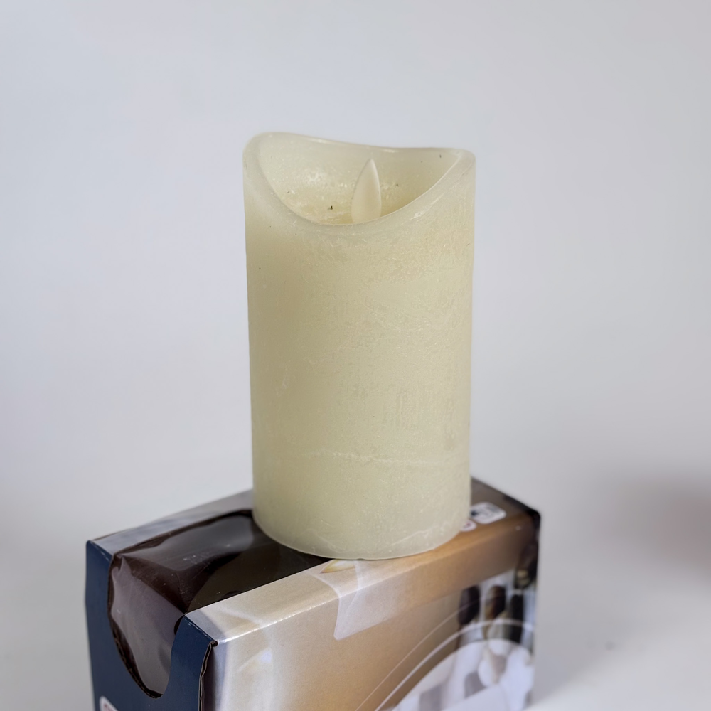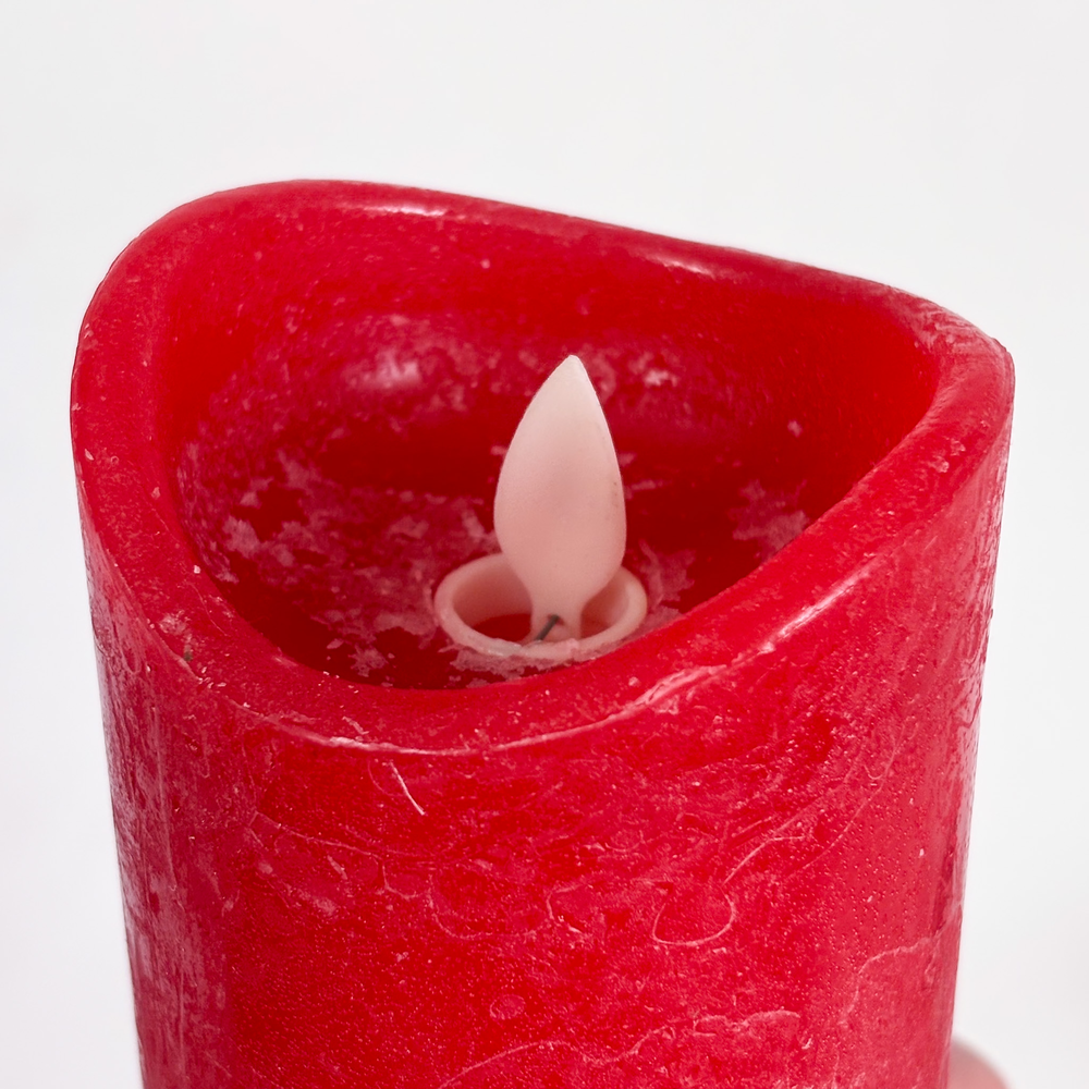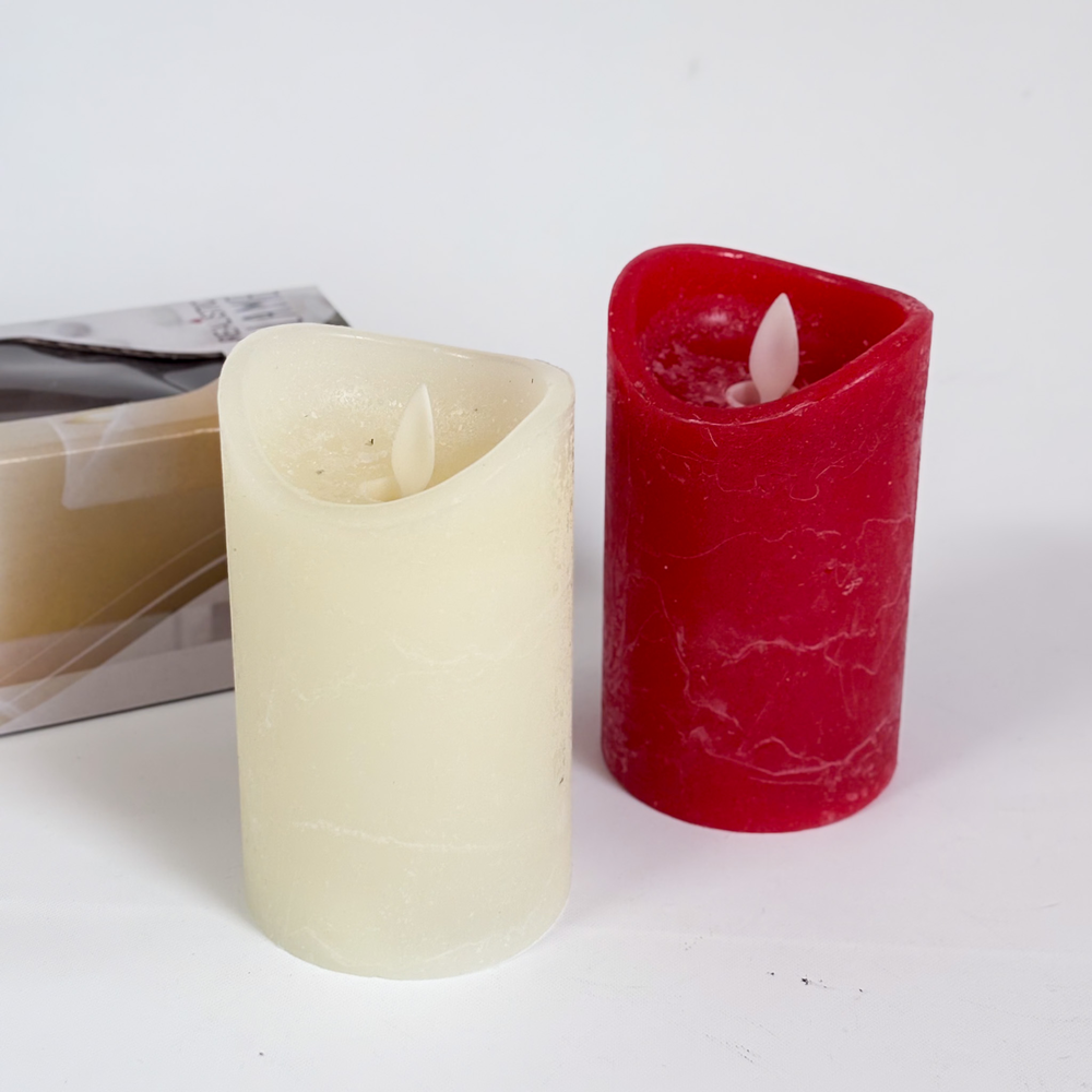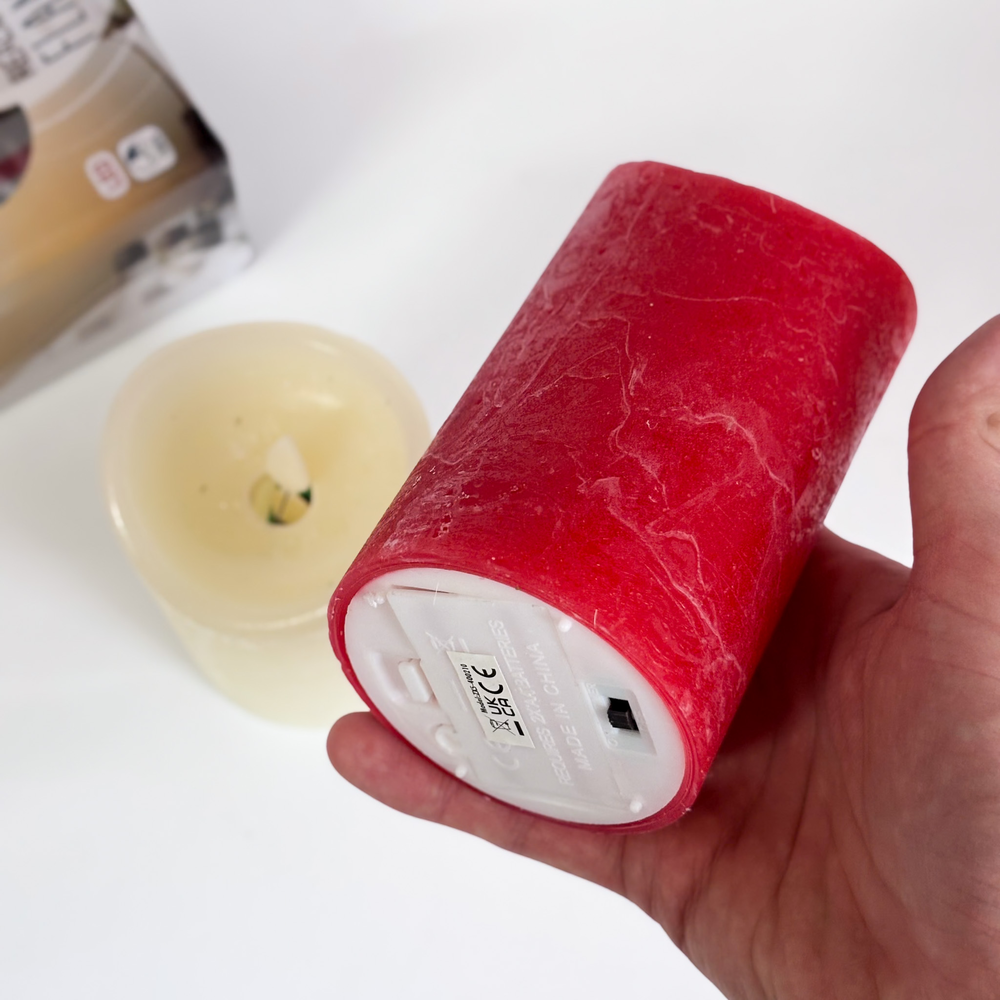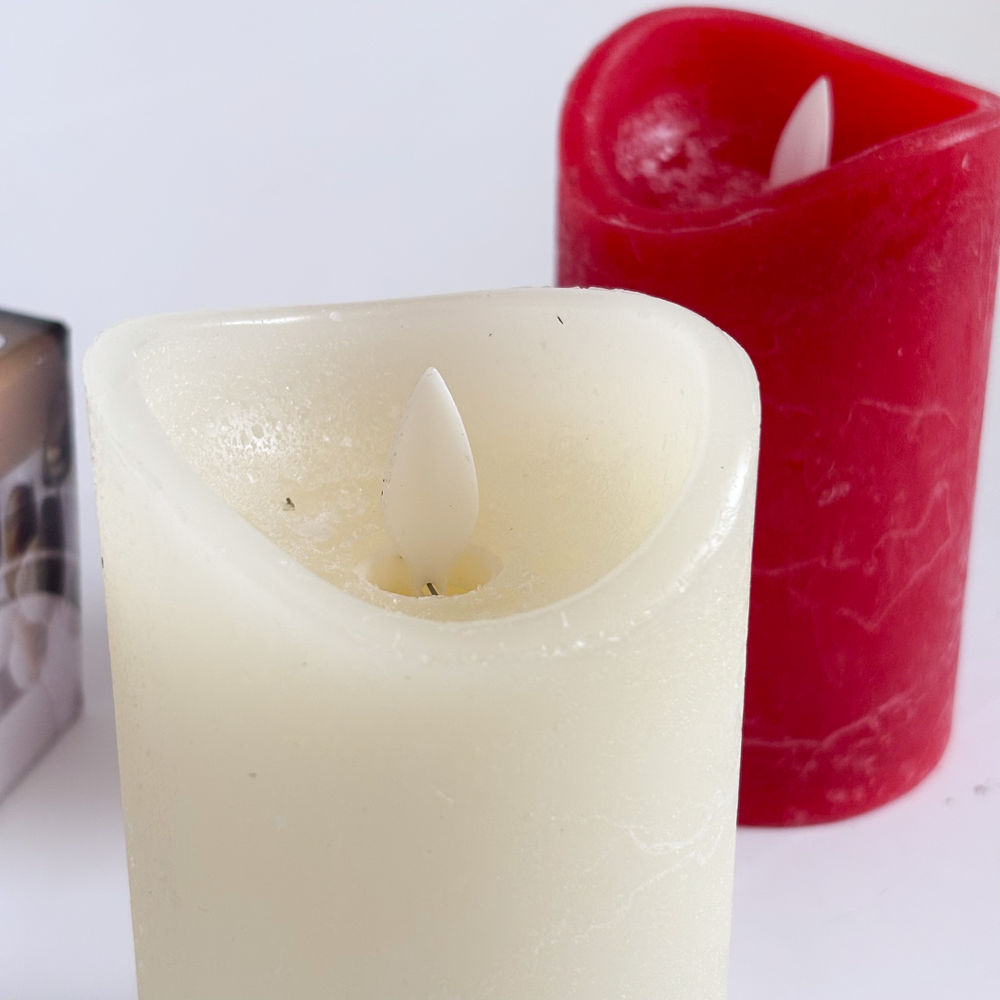 Vela de cera con llama realista de LED a pila con efecto de flameo y función de temporizador para apagado automático. Disponibles en color blanco y rojo. Dimensiones 7.5 x 12.5 cm