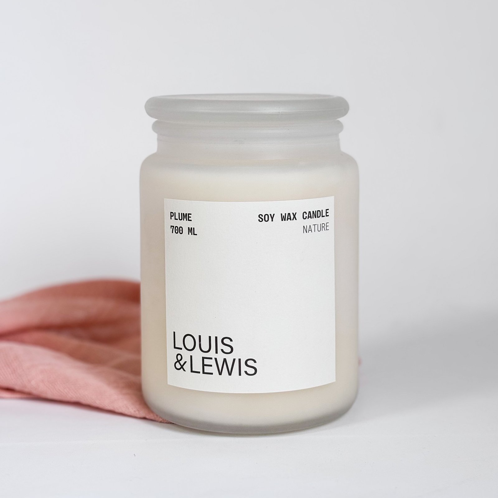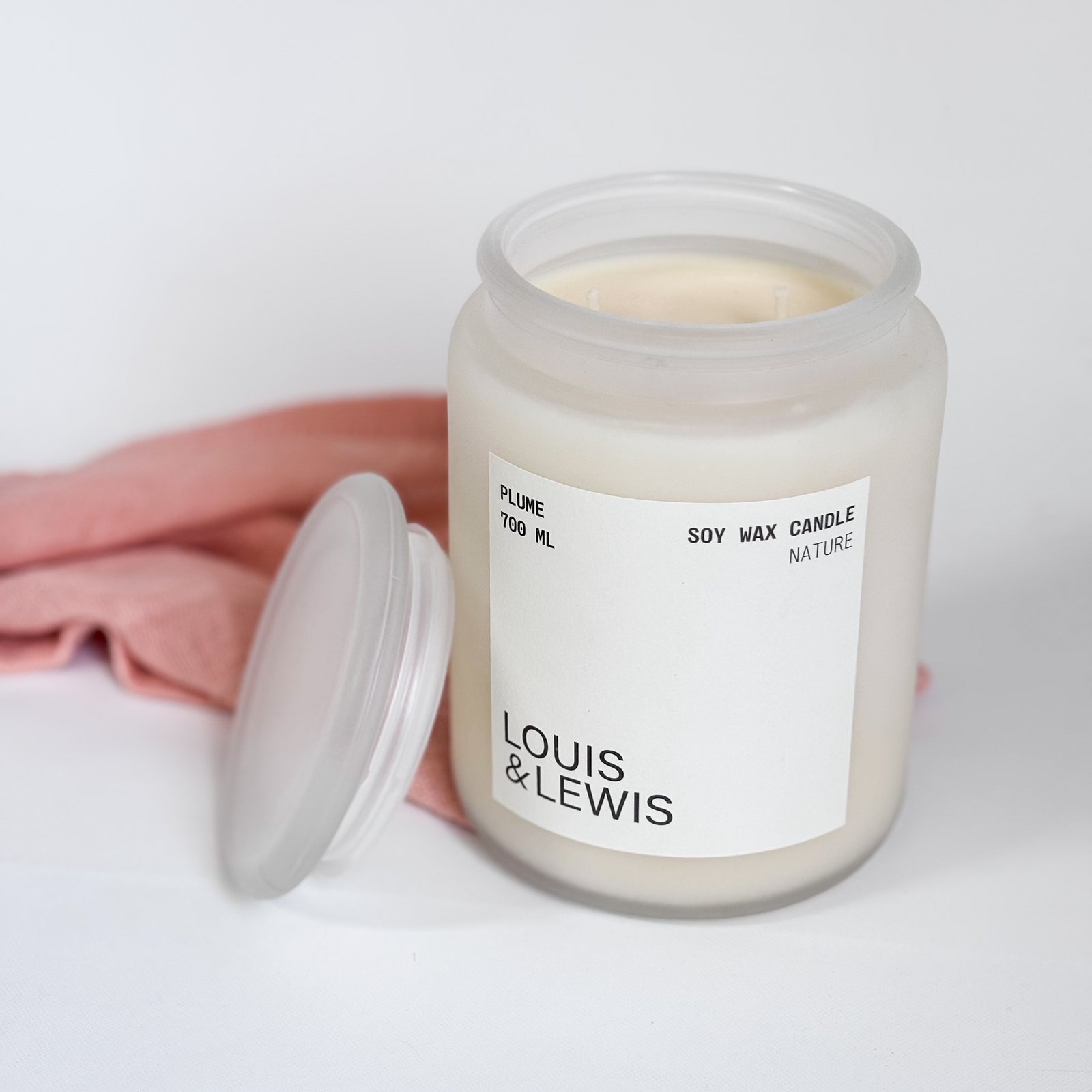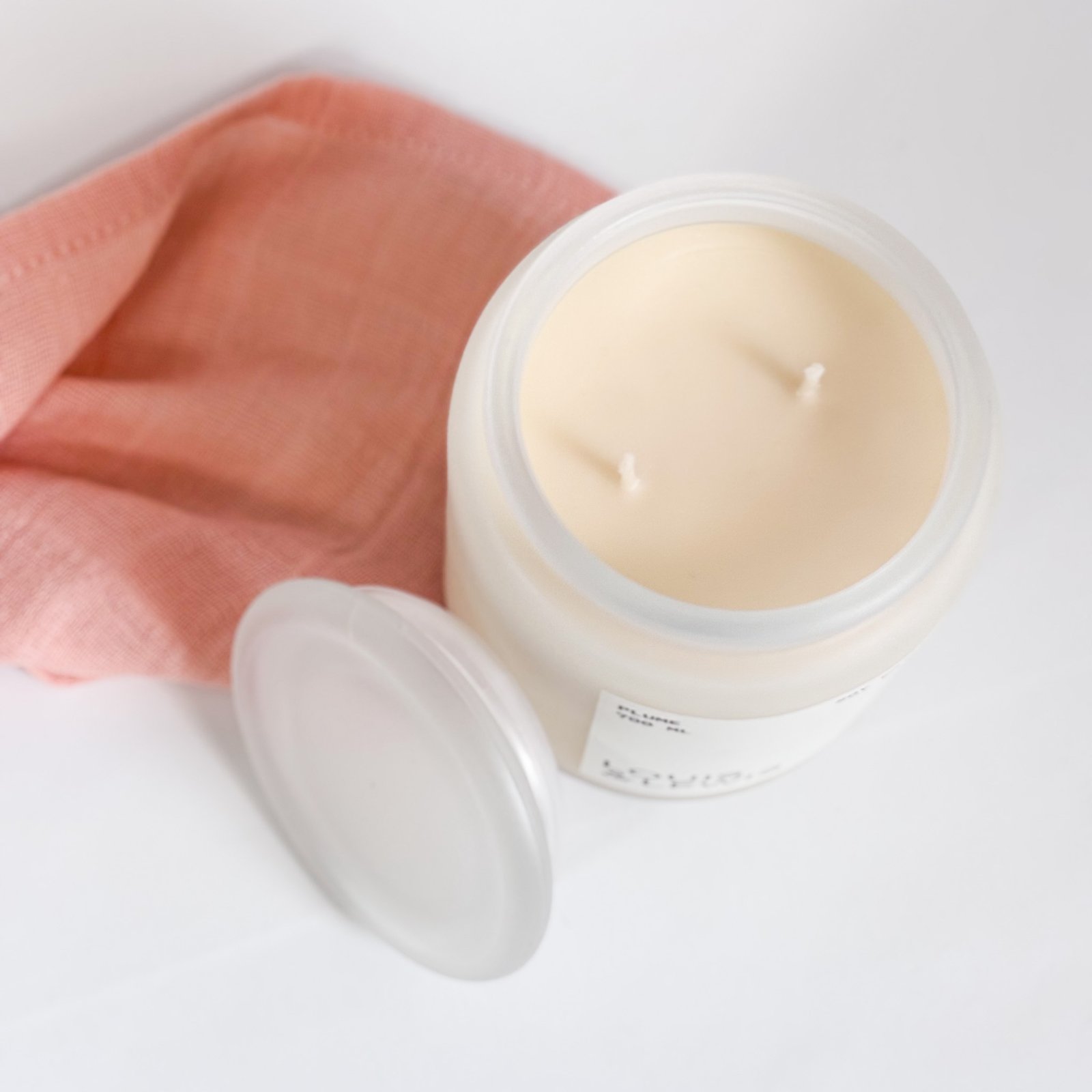 Vela de cera de soja 100% natural. Contenedor de vidrio esmerilado con tapa hermética.